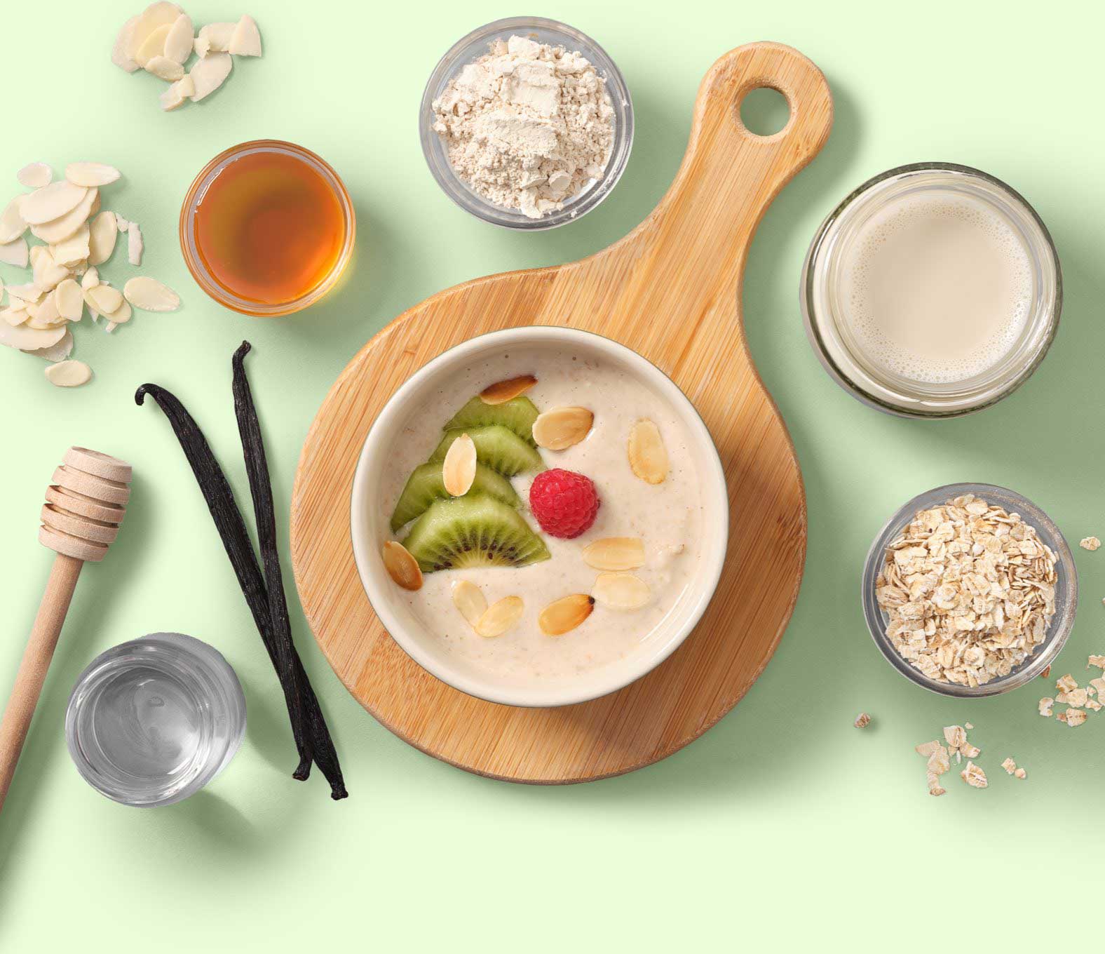 Pon la avena y el agua en una olla y deja que hierva y se cocine a fuego lento durante unos 3 minutos. Deja que las gachas se enfríen antes de añadir la bebida vegetal de almendras y la proteína de arroz en polvo. ¡Decora almendras, fruta y endulza con miel al gusto y tus gachas proteicas estarán deliciosamente listas!